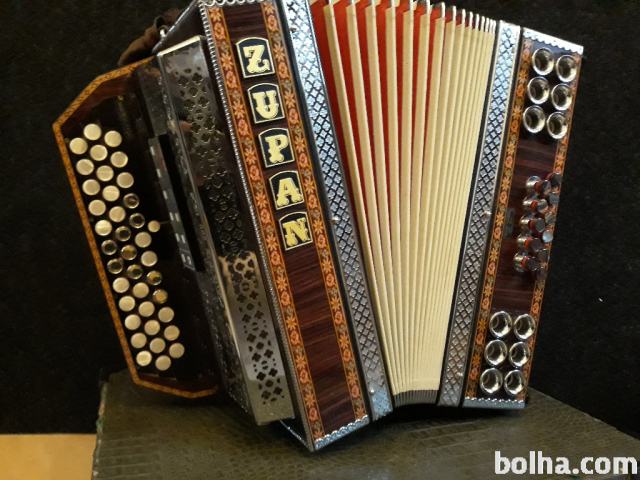 Najem diatonične harmonike Zupan C-F-B, Harmonika je rabljena, 38 cm visoka, 1 dodatni gumbi.