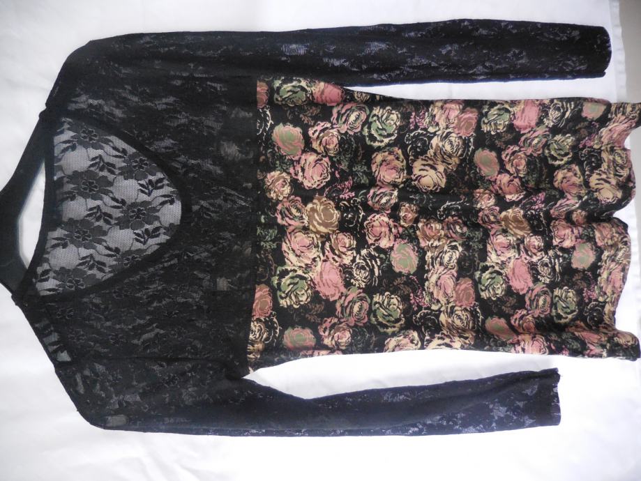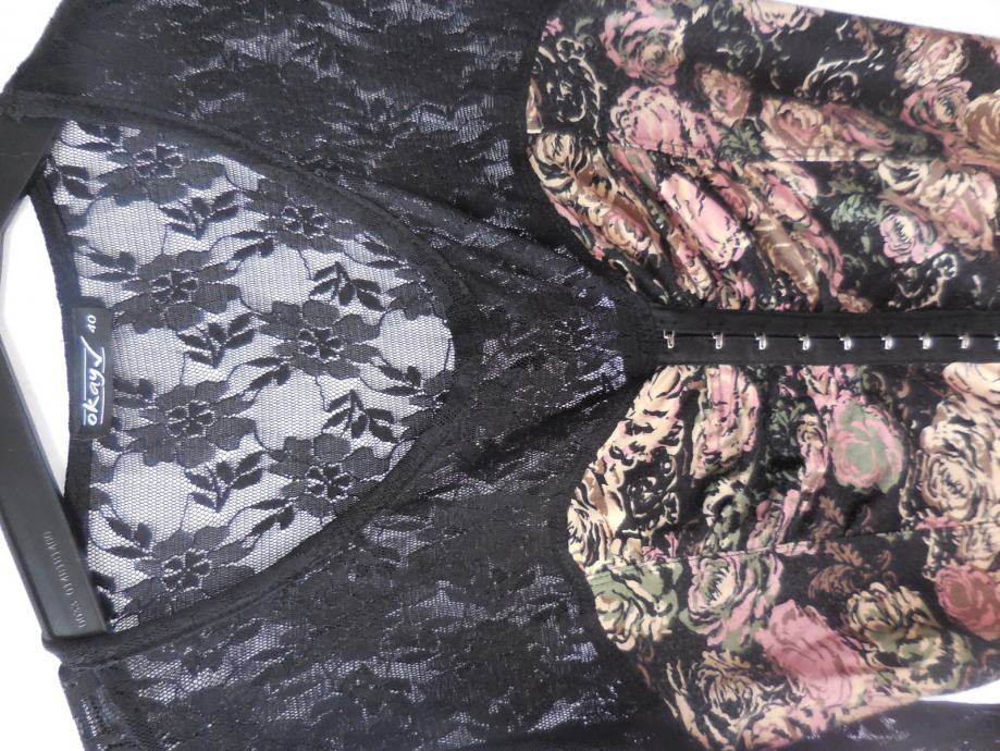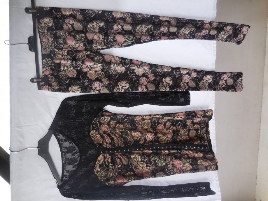 Enkrat oblečen komplet pajkic in tunike v črni barvi s temno roza in zelenimi rožami. Zgornji del tunike in rokavi so iz čipke. Hakelčki na tuniki so samo okrasni in se ne odpenjajo. Komplet je raztegljiv.