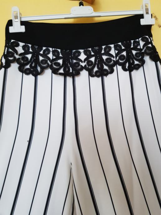 Hlače so širšega kroja, dolžina je 3/4 in merijo v pasu 35cm, dolžina je 90cm, zapenjajo se ob strani z zadrgo