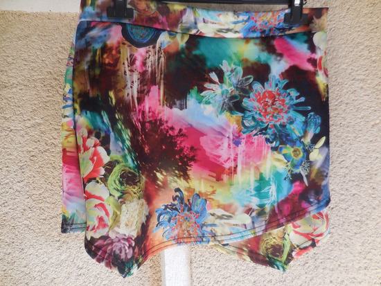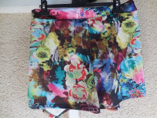 Hlače so spredaj kot mini krilo, zadaj pa kot kratke hlače, v pasu imajo 4cm široko elastiko in v neraztegljivem stanju merijo 38cm, dolžina najdaljšega kraka spredaj je 38cm.