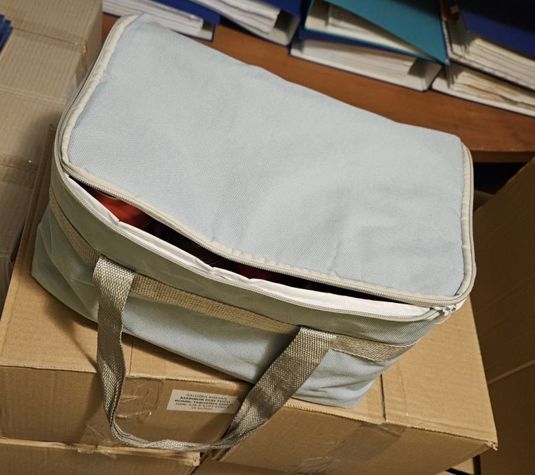 HLADILNA TORBA, prenosna, svetlo/nežno modro bele barve....za 15 pločevink piva, kot nova, vrhunska....prodam za samo 9,99 eur