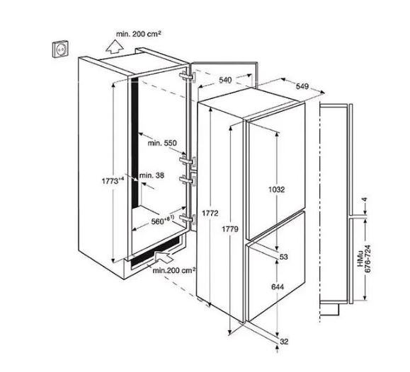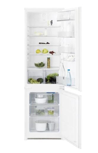 Vgradni kombinirani hladilnik Electrolux ENN2811BOW s skupno prostornino 268L, od česar 196l pripadajo hladilnemu, 72 L pa zamrzovalnemu delu.