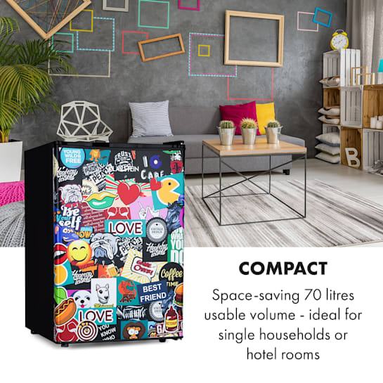 Klarstein Cool Vibe 70+, hladilnik, 72 l, 2 polici, stil Stickerbomb
