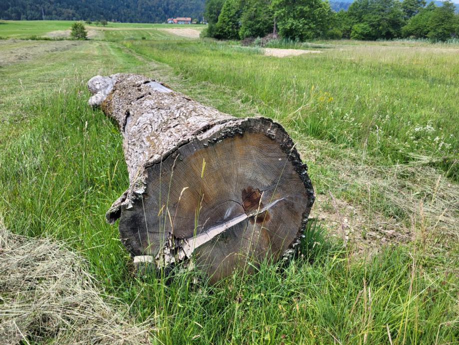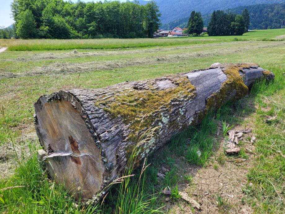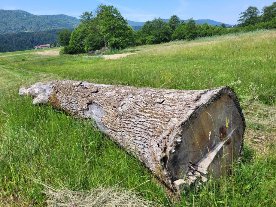 Hrast, hlod, v spodnjem delu meri cca 1 m, dolžine 6 m, podrto pozimi