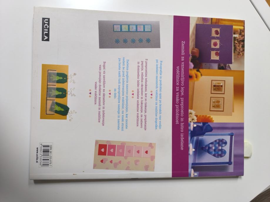 Izdala UČILA ; 103 strani, več kot 80 zamisli za različne dogodke, oz. za vse priložnosti.Preproste tehnike ( tiskanje, prepletanje papirja, reliefne okrasitve, luknjanje ). S šablonami. Odlično ohranjena.Tel.: 040 717 010