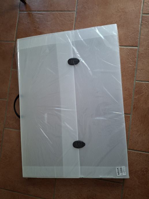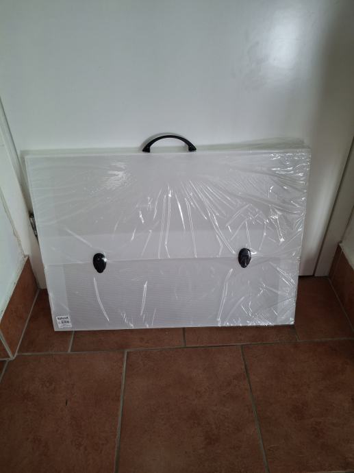 Plastična torba z ročajem, iz valovite plastike. Primerna za shranjevanje likovnega pribora. Nerabljena. Dimenzije 71cm x 51cm x 3,5cm.