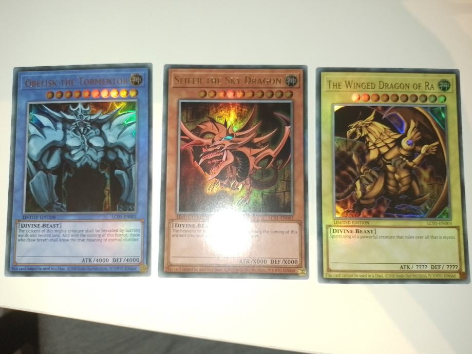 Prodajam vse 3 egipčanske bogove (Obelisk the Tormentor, Slifer the Sky Dragon, The Winged Dragon of Ra). Vse karte so v angleščini in v brezhibnem stanju.