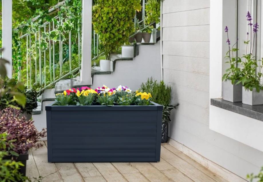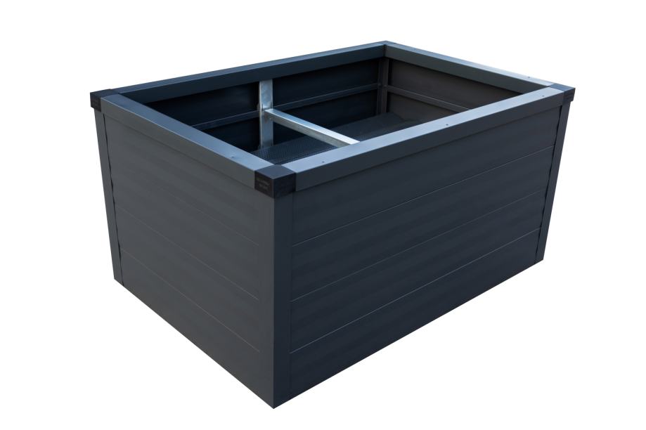 Kovinska visoka vrtna greda 1m x 1m (višina 570mm), 3 lamele v višino, pocinkana antracit 7016. Višina grede je 570 mm. Je izredno trpežna in trajna. Material iz katerega je greda izdelana, je pocinkano in barvano jeklo, debeline 0,55mm, kar zagotavlja dolgo življenjsko dobo brez vzdrževanja.