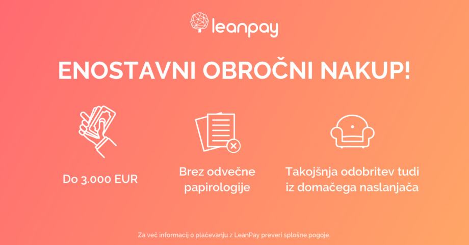 Izdelke lahko kot fizična oseba kupite tudi preko LeanPay obročnega odplačevanja (do 24 obrokov).