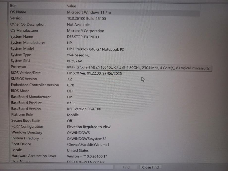 Procesor: Intel(R) Core(TM) i7-10510U CPU @ 1.80GHz, 2304 Mhz, 4 Core(s), 8 Logical Processor(s)
