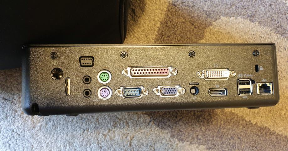 Docking postaja omogoča razširitev priključkov, kot na sliki: 4x USB, ethernet, VGA, DVI, Display port, napajalnik, COMport, LPT priključek za starejše printerje, PS2 za miško in tipkovncio, ter 2x 3,5mm slušalke/mikrofon.