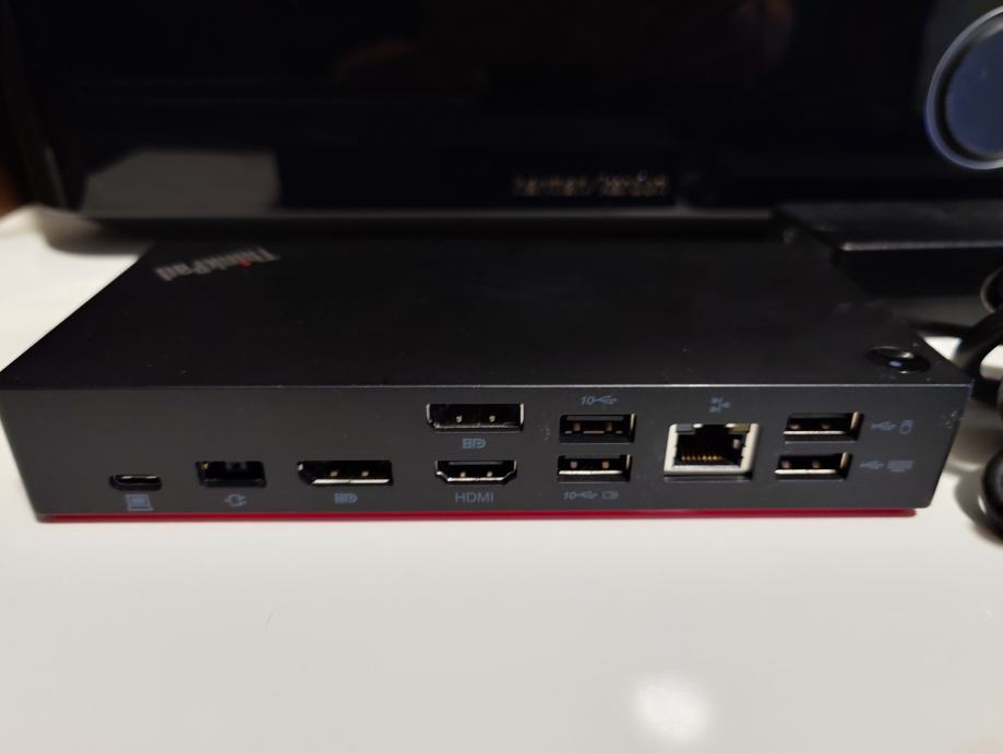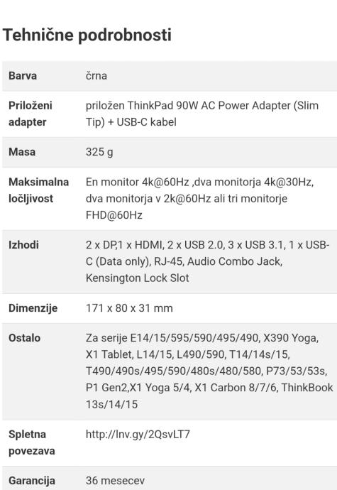 Prodajam rabljeno priklopno postajo Lenovo ThinkPad USB-C Dock Gen 2 v črni barvi z bogatimi možnostmi povezovanja. Omogoča priklop do treh monitorjev in ima številne izhodne priključke (2 x DP1 x HDMI, 2 x USB 2.0, 3 x USB 3.1, 1 x USB-C, RJ-45, Audio Combo Jack). Združljiva je s številnimi modeli ThinkPad serij E14/15, X1, L14/15, T14/15 in drugimi.