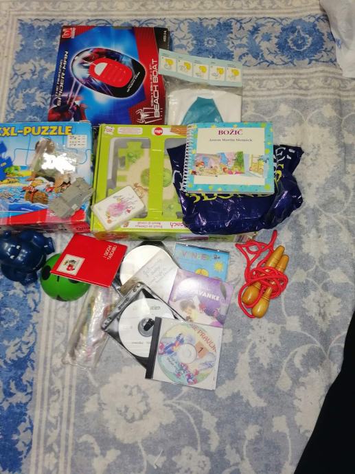 Podarim razne igrace za najmlajse..razne puzle,kolebnico..karte crni peter..hranilniki,napihljiv nov col za otroka in napihljiva zoga....cd-ji s otroskimi pesmicami..zgodbice..uspavanke..zogica...