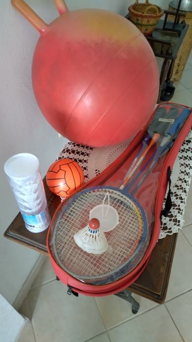 Podarim,6 loparjev+ 8 žogic za badminton,malo žogico in veliko rdečo žogo za skakanje,za otroke,vse kar je na sliki podarim,ohranjeno,okolica Postojne,kontakt 051 330 948