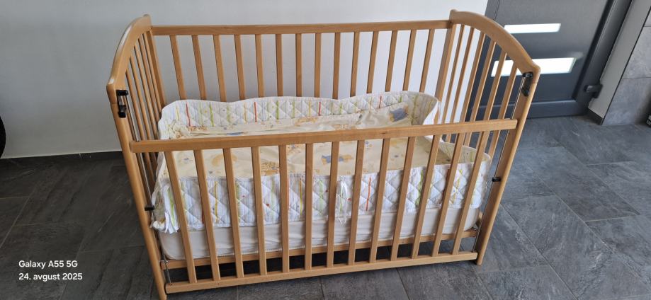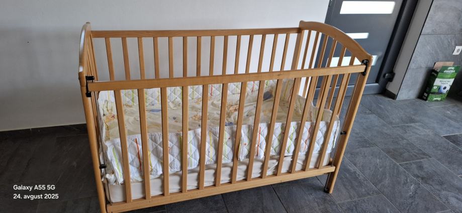 Posteljica ima spustno stranico za lažje polaganje in dvigovanje otroka.