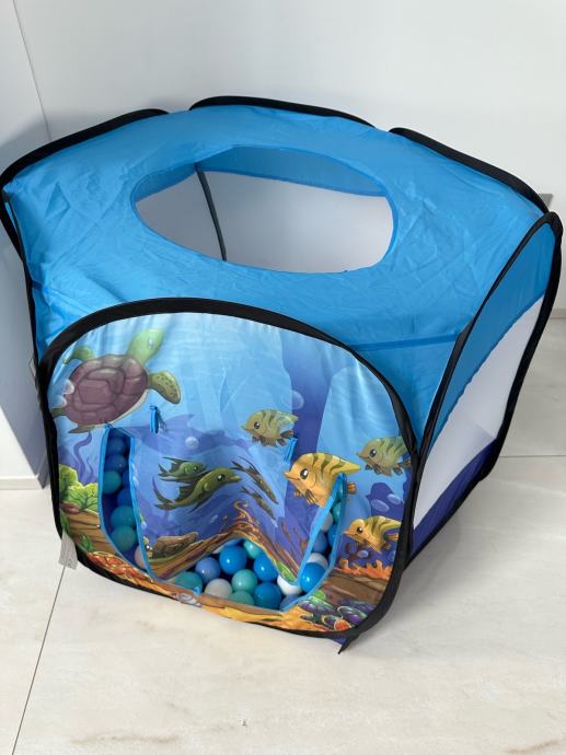 Prodam rabljen a čudovit zložljiv skrivalni šotorček oz. bazen z modro belimi pvc žogicami v morski tematiki. Odličen za malčke.