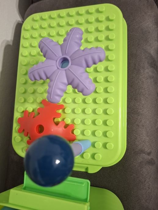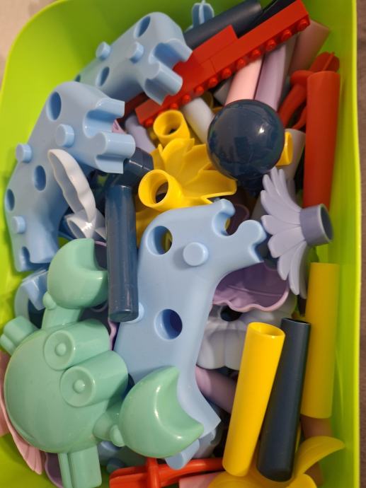 Otroška konstrukcijska igrača – tip večjih plastičnih gradnikov v škatli (tulci, cvetki, morske živali ipd.), namenjeno mlajšim otrokom (cca 2–5 let).