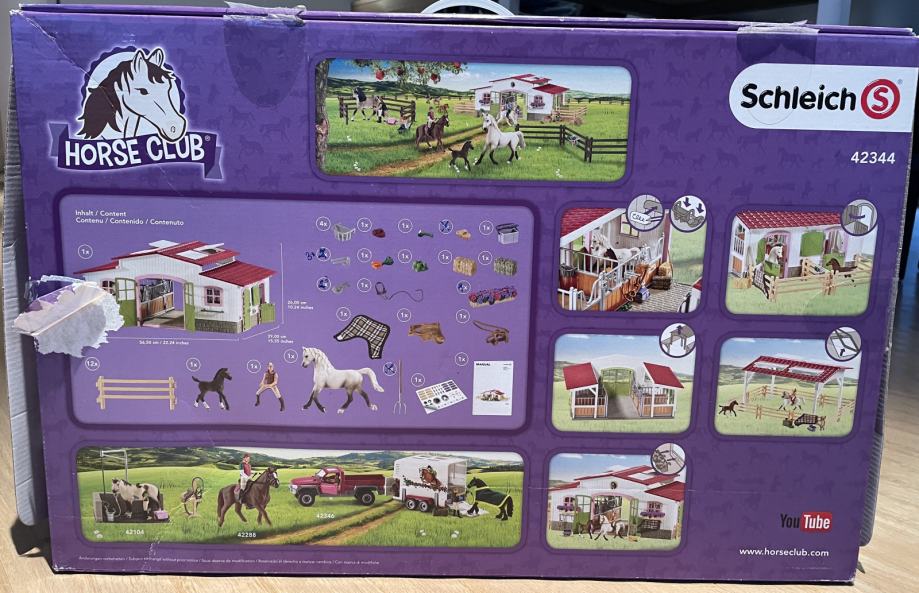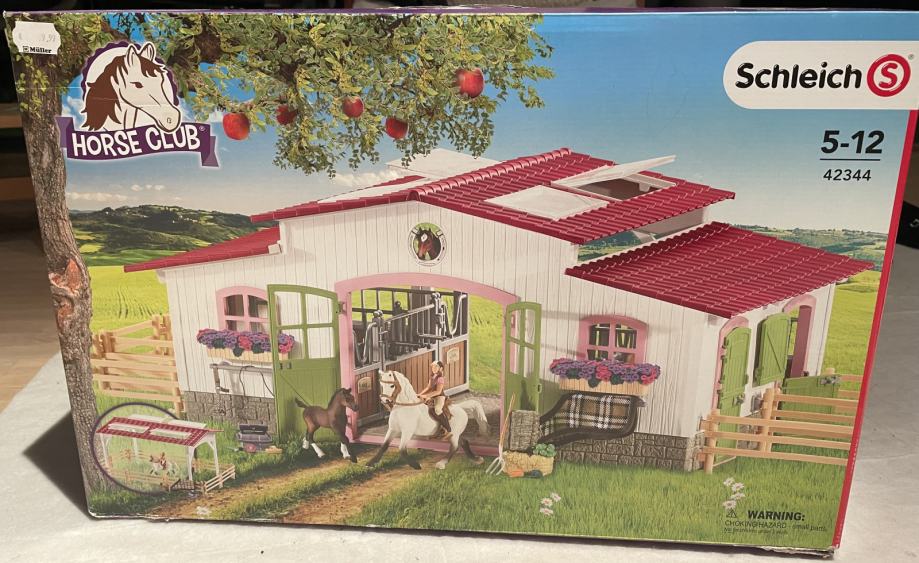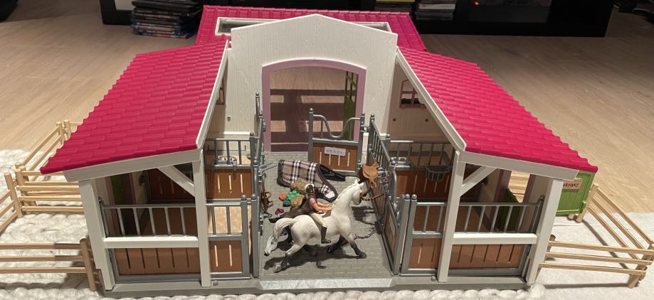 Igralni set Jahalni hlev z jahačem, konji in dodatki je v originalni škatli. Vse deluje in nič ni zlomljeno. Manjka nekaj malih dodatkov, kar je razvidno na sliki.