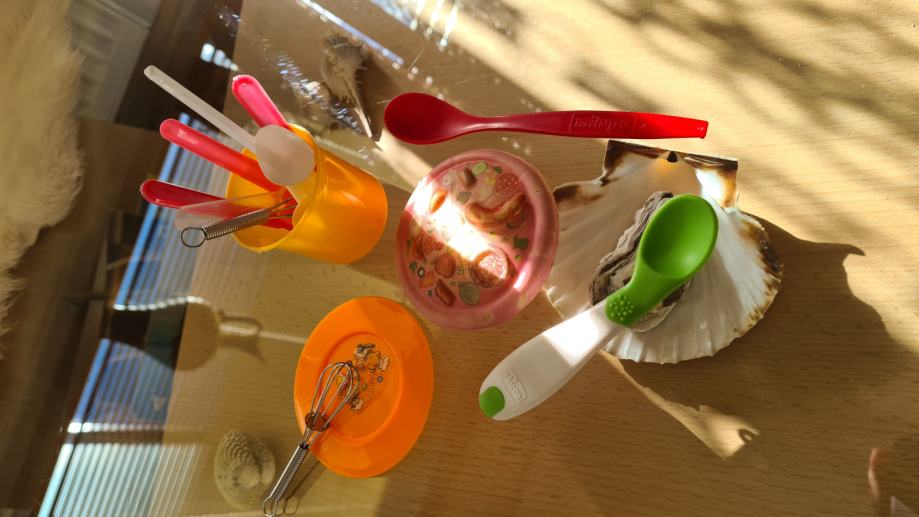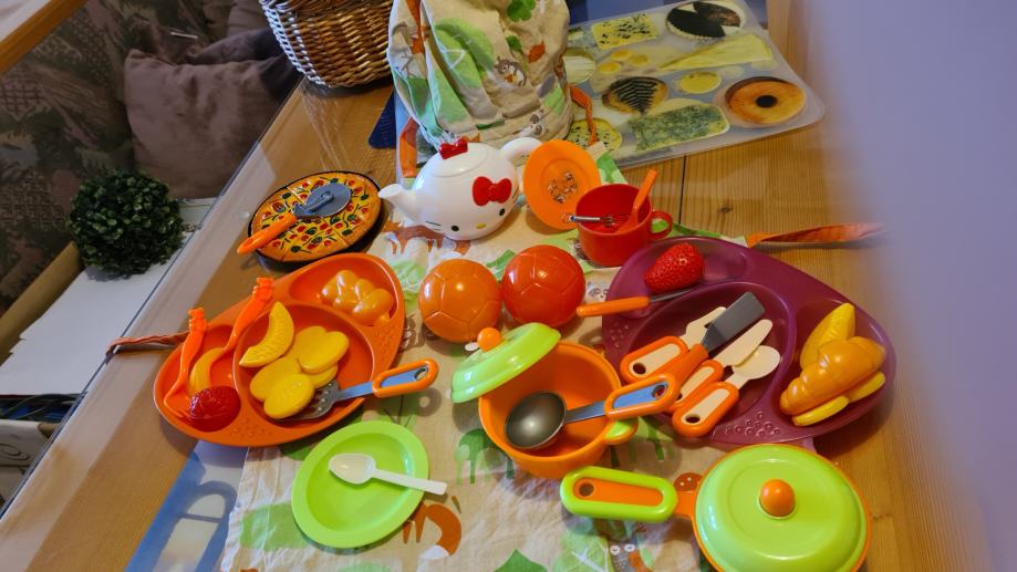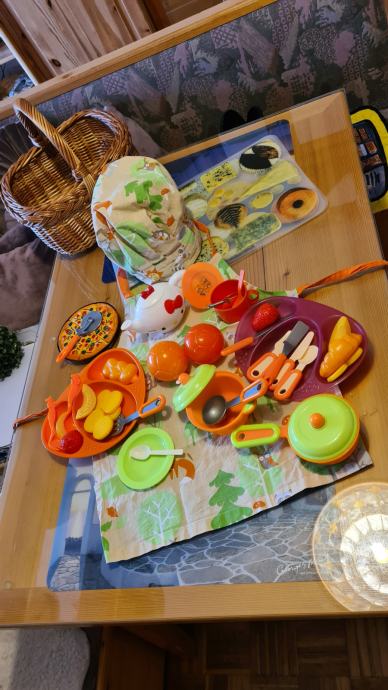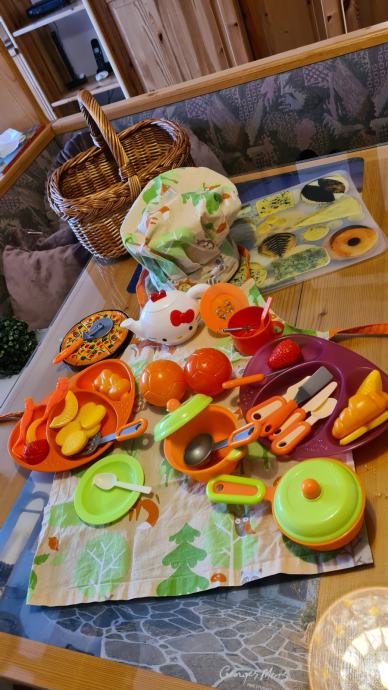 Prodam lepo ohranjen velik set za kuhanje, kateri sestavljen iz predpasnika, kuharskega klobuka, čajnika in druge posode.
