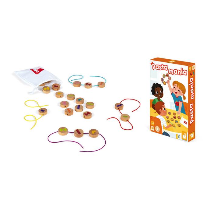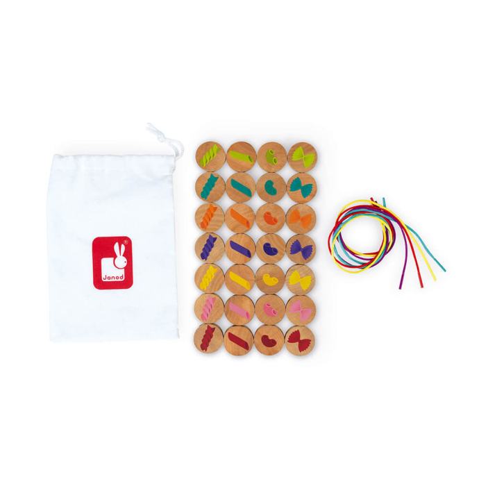 Igra spodbuja logično razmišljanje, opazovanje in hitrosti! Igra vsebuje 28 lesenih perlic z testeninami, 4 vrvice in 1 vrečko iz blaga. Perlice so iz masivnega lesa, vrečka in vrvice iz blaga.
