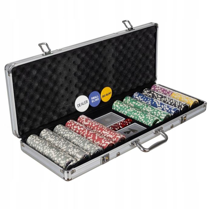 - KOMPLET – v našem kompletu ponujamo: 2 kompleta kart po 54 kosov, 5 kock, 500 žetonov (ki imajo v notranjosti še kovinski disk, tako da so težki in močni), 3 funkcijske žetone, zeleno blago / igralno podlogo in trden kovček s ključi.