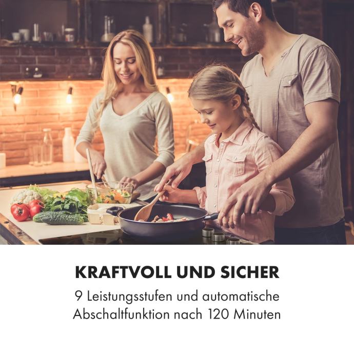 Vgradna indukcijska kuhalna plošča Klarstein Kochheld je resnično učinkovita. S štirimi kuhalnimi ploščami prinaša v vašo kuhinjo moč 6000 W ter vam vzame dih s svojim preprostim dizajnom v črni preobleki in vrtljivimi gumbi za vsako ploščo posebej.Vgradni štedilnik predstavlja štiri ločene kuhalne plošče, katerih moč se lahko prilagaja z izbiro 9 stopenj ob uporabi vrtljivih gumbov. Zaradi dimenzij 59 x 52 cm (Š x D) je na štedilniku vedno dovolj prostora za različne lonce, ponvice ipd. Premer kuhalnih plošč zadaj levo in spredaj desno znaša 16 cm, vsaka deluje z močjo 1200 W, medtem ko premer plošč spredaj levo in zadaj desno znaša 18 cm, vsaka deluje z močjo 1800 W. Indukcijska plošča je povsem samostojna in jo lahko vgradite neodvisno od pečice. Celostno podobo 4-conske indukcijske kuhalne plošče elegantno zaključuje črno steklo in oblika brez okvirja.Izjemno priročna je uporabljena indukcijska tehnologija, ki poskrbi, da površina izven lonca celoten čas kuhanja ostane hladna. Kuhalna plošča Kochheld blagovne znamke Klarstein se lahko pohvali še s funkcijo samodejnega izklopa po 120 minutah. 5-polni in 120 cm dolg priključni kabel poskrbi za potrebno moč vgradne indukcijske kuhalne plošče.Zmogljiva, s sofisticirano tehnologijo in okusnim dizajnom: 4-conska indukcijska plošča Klarstein Kochheld vas bo spremenil v kuharskega mojstra!Izdelek lahko vgradi samo izkušeno in ustrezno usposobljeno osebje.