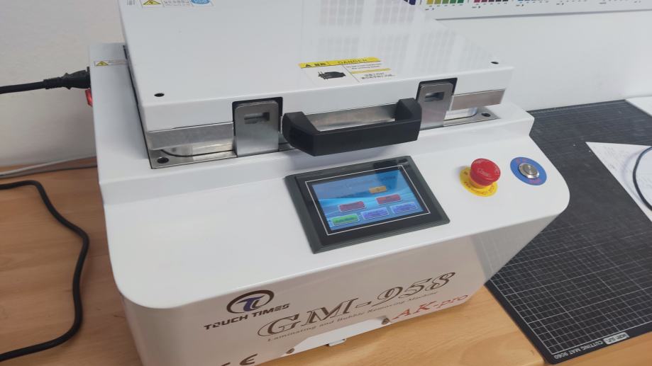 Vakuumsko-tlačni laminator je namenjen začetnemu termičnemu (40-50C) spajanju LCD zaslona in stekla telefona/tablice z uporabo OCA lepilnih obližev. Celoten proces je sestavljen iz stiskanja obeh spojenih elementov z ogrevano tlačno stiskalnico pri tlaku 0-10 kg / cm2 v pogojih vakuuma (-94-98kPa).