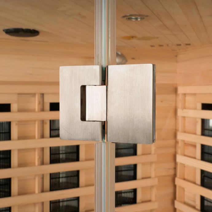 Prepričala vas bo tudi kakovost: les hemlock je eden najboljših in najgostejših lesov na svetu. Zaradi svojih naravnih lastnosti ima odlično toplotno izolacijo in je zato idealen za sisteme savn. Toplota ostane v notranjosti kabine, zunanja plast infrardeče kabine pa doseže skoraj sobno temperaturo. Zahvaljujoč tej lastnosti dragocenega materiala se toplota skoraj ne izgublja, kar preprečuje nepotrebno porabo energije. Zaradi dvojnega grundiranja in lakiranja zunanjega lesa ima infrardeča kabina veliko daljšo življenjsko dobo kot mnoge druge savne. Les v notranjosti je namenoma neobdelan.