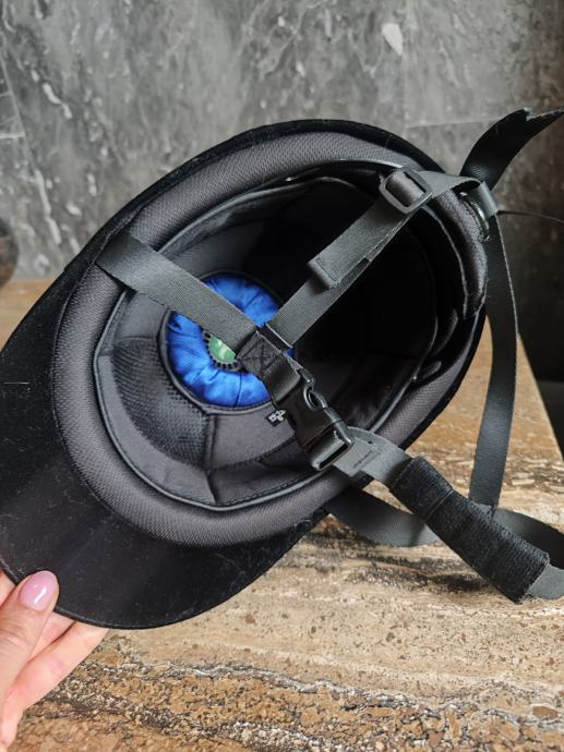 Prodam lepo ohranjeno in čisto (posebej oprano) otroško jahalno čelado, črne barve, plišasta prevleka, velikost S, 51-54 nastavljiva velikost z gumbkom zadaj, podložena, udobna za nošenje.