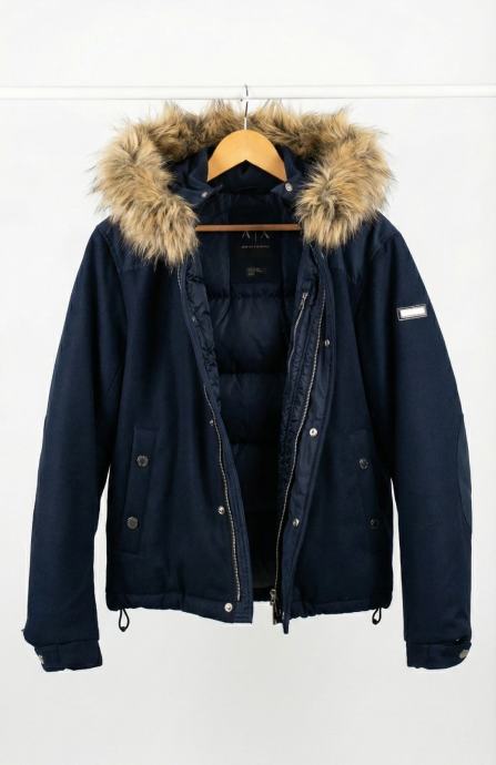 Prodajam rabljeno zimsko jakno Armani Exchange v modri barvi, velikosti M. Jakna ima privlačno krzneno obrobo na kapuci in je v dobrem stanju. Idealna za hladne zimske dni, združuje prestižno blagovno znamko s praktično zasnovo.