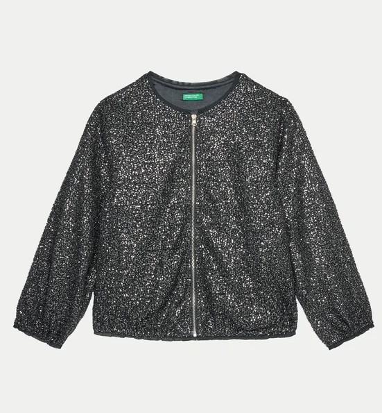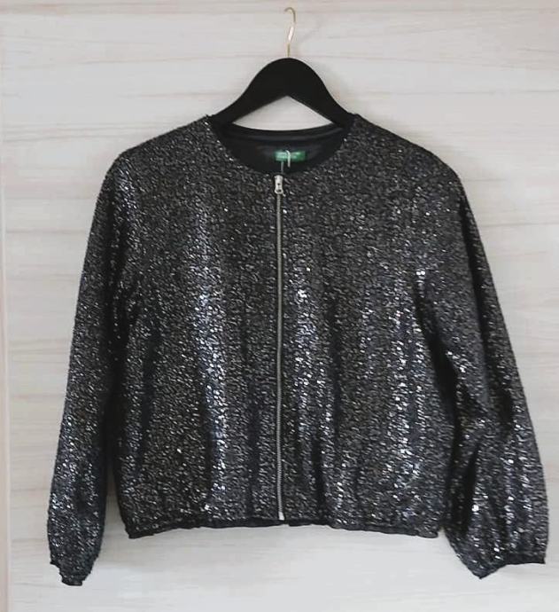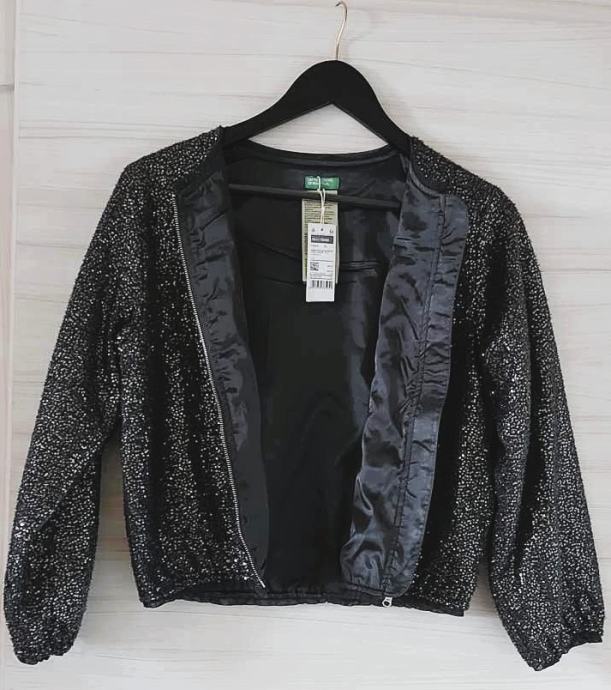 Jakna je nova, nenošena, še z originalno etiketo. Je črne barve, z bleščicami, dolgi rokavi, regular fit, zapenjanje na zadrgo. Cena 20€.