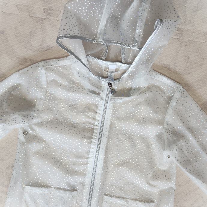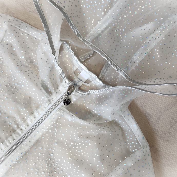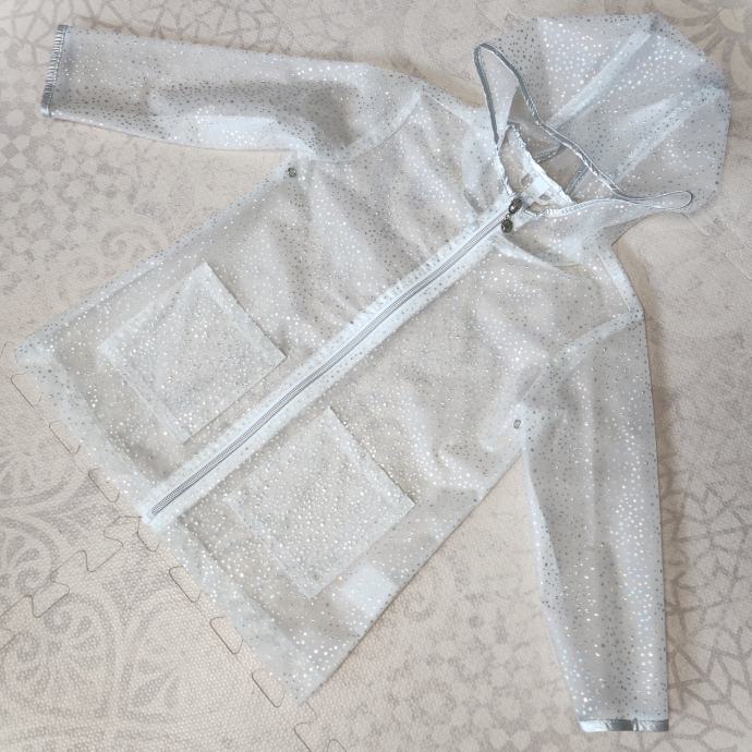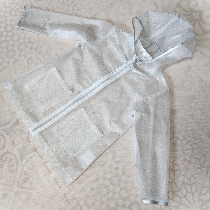 Prodam 3x oblečen dežni plašč znamke Idexe, za punčko staro 4 leta oz. velikosti 104. Prozoren material s srebrnimi bleščicami, zasnovan s kapuco, zadrgo po celi dolžini in sprednjima žepoma. Je takšen, da se jo lahko nosi že prej ali pa malo dlje. Plašč je bil oblečen le trikrat, zato je praktično nov. Mi smo ga žal prehitro prerasli. Prevzem v Ljubljani ali po pošti (+ poštnina).