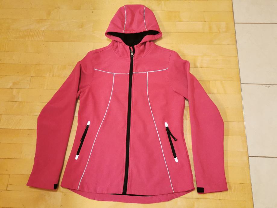 ciklamne roza barve (kot na 3. sliki), tajliran kroj, s kapuco, zapenjanje z zadrgo, 2 stranska žepa na zadrgo,
