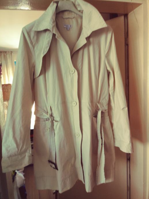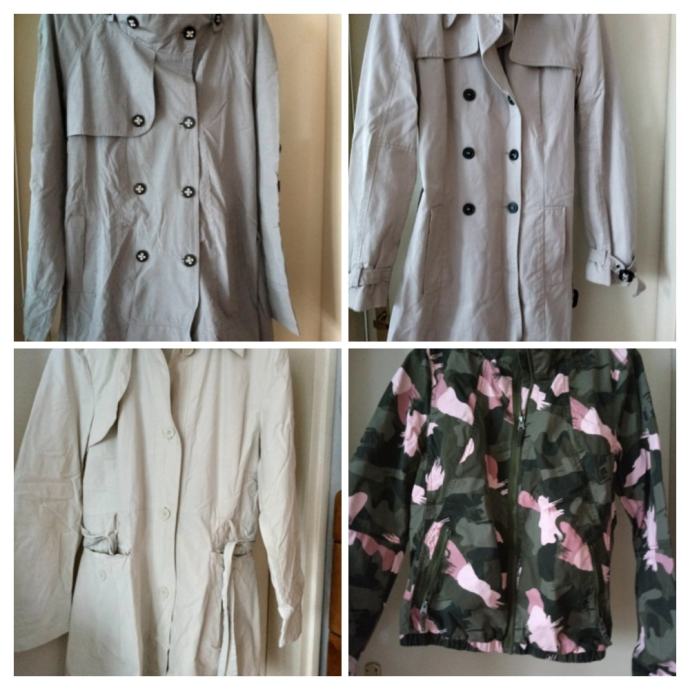 jakna je L velikosti, zelo lepo ohranjena - 12 eur, tanka jaknica plavo-bele barve s pasom in dvema žepoma nova. It. Št 44-10 EUR, tanka krem jakna XL št. 12 eur, podložen bombažni trenč Zara basic nova 20 eur, jakna zeleno roza Q/S s kapuco nova - 15 eur