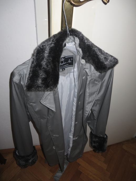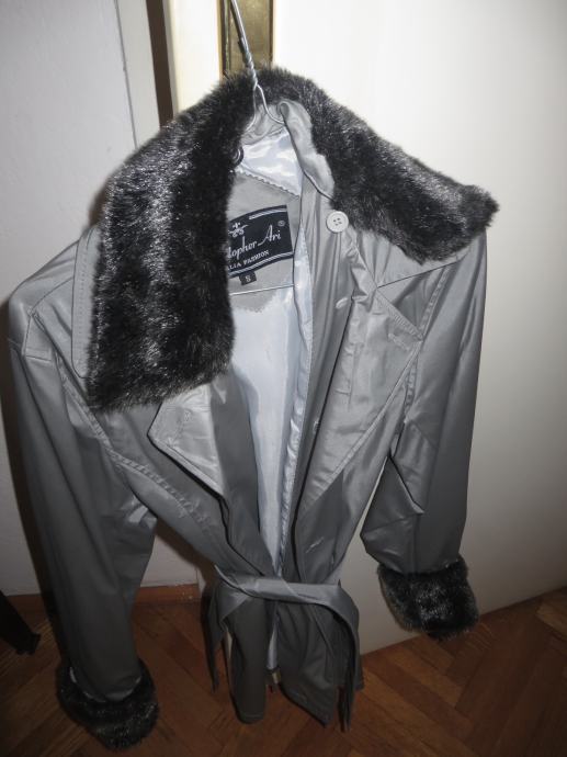 ohranjena ženska siva jakna št. S/M, oz. št. 38-40snemljiv ovratnik, iz poliuterana (gladek material, s katerega spolzi voda). Ovratnik in okrog zapestja iz umetnega krzna je snemljiv. Ima pas. Imam veliko ostalih oblačil, obutev, igrače, knjige, božični dekor, leseno smrečico, ... 041 305 357