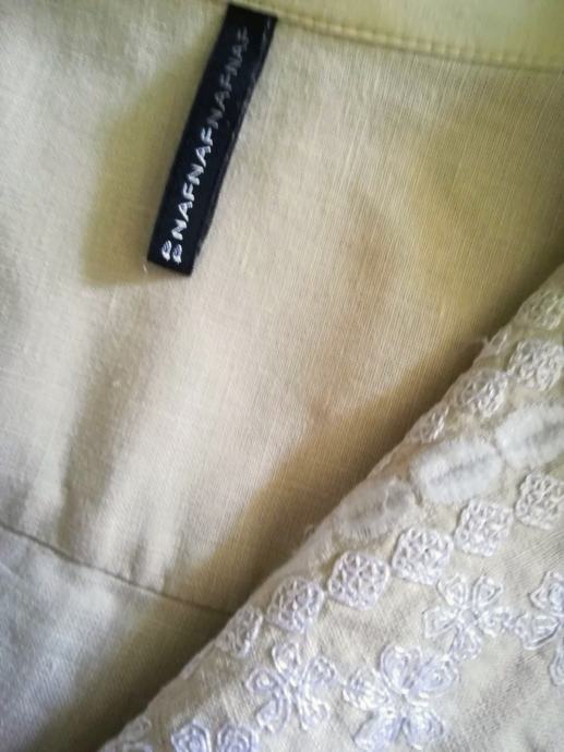 Lep, ženstven, lanen poletni suknjič, kratki rokavi, lepi detajli. Znamka Nafnaf. Razdalja pazduha-payduha 50 cm, hrbtna dolžina 59 cm.