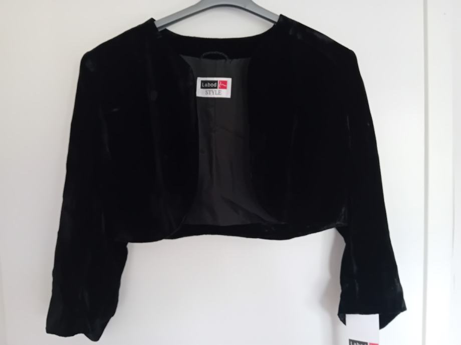 Prodam NOV bolero znamke LABOD št. 38. Sestava: 82% viskoza in 18% poliamid. Preko ramen meri 41 cm, dolžina 34 cm. Na otip je zelo mehek kot pliš, notranjost je podložena. Cena: 10 € + ptt.