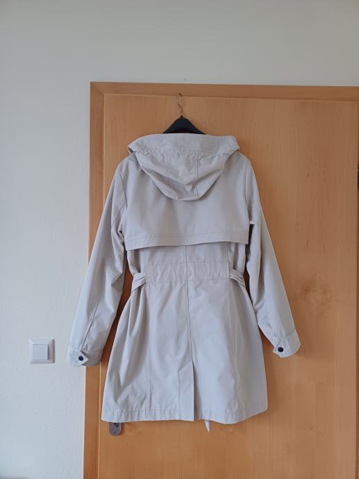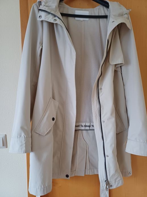 Jakna S Oliver v svetlo bež barvi iz kvalitetnega materiala. Spredaj z zadrgo in žepi ter gumbi. Ima tudi pas, ki se zaveže okrog pasu. Ima tudi kauco. Velikost 40. Je kot nova.