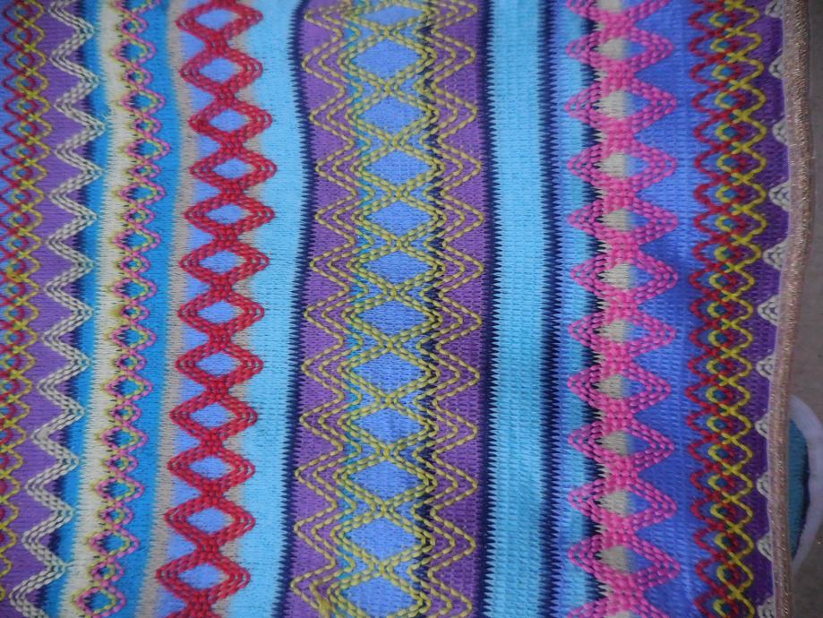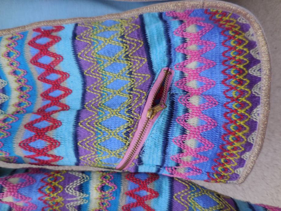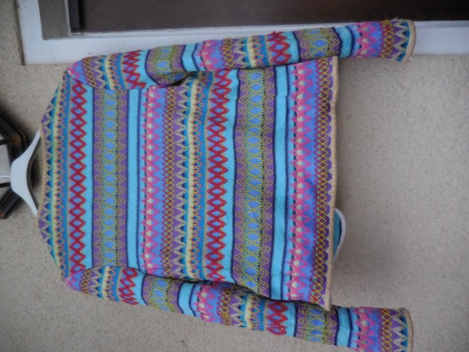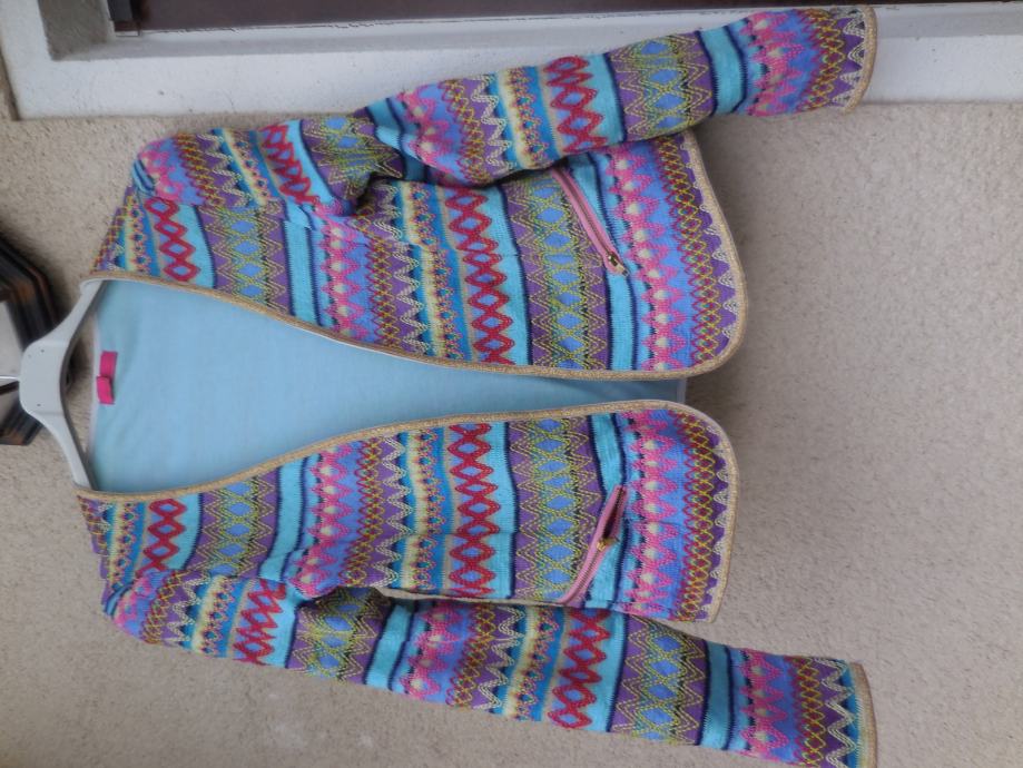 Zelo lep ohranjena pisana spomladanska pletena jakna. Je podložena in raztegljiva. Na sprednji strani ima dva žepa na zadrgo, nima gumbov in je obrobljena je s svetlečim zlatim trakom.