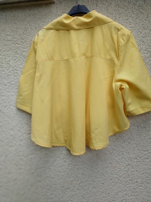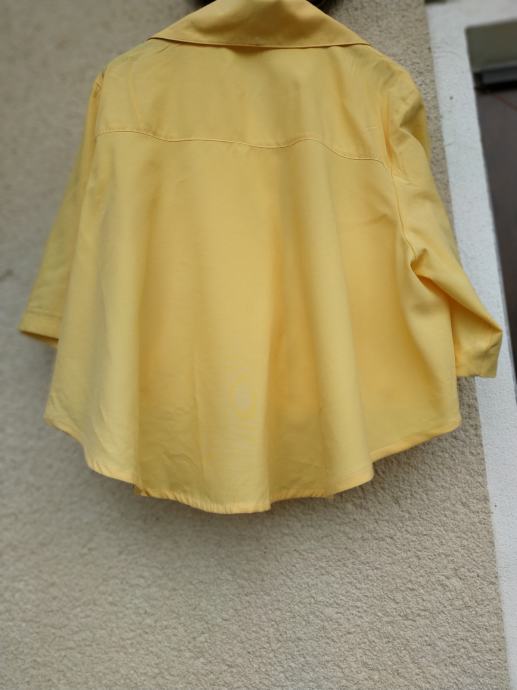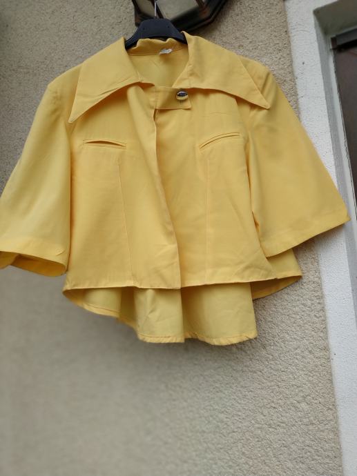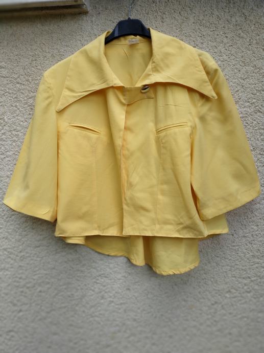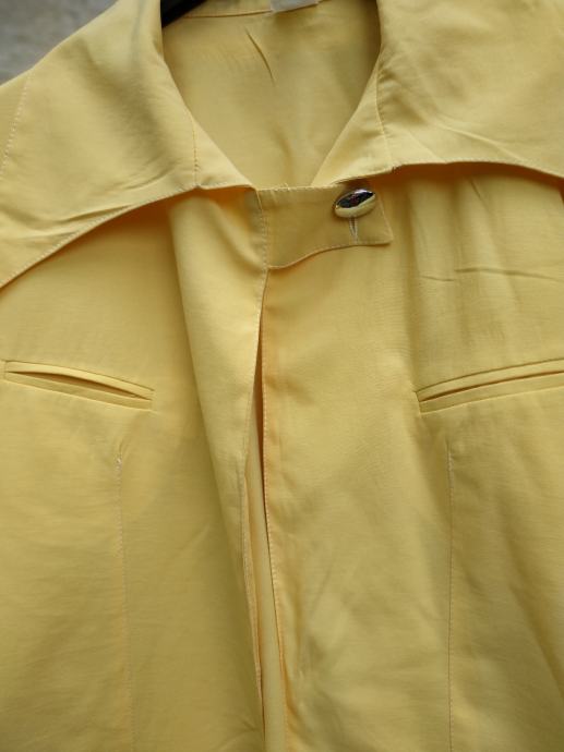 Barva je nekoliko bolj rumena kot na sliki, zelo lepo ohranjen, brez znakov nošenja, ni podložen in ni raztegljiv, zadaj daljši kot spredaj, zapenja se z 1 gumbom.