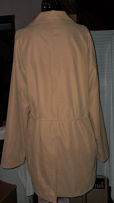 Prodajam elegantno žensko prehodno jakno v velikosti 38, ki je v rabljenem stanju. Bež jakna ima klasičen ovratnik, gumbe spredaj in pas v pasu za bolj poudarjeno silhueto. Ima tudi priročne žepe in je primerna za prehodna obdobja.