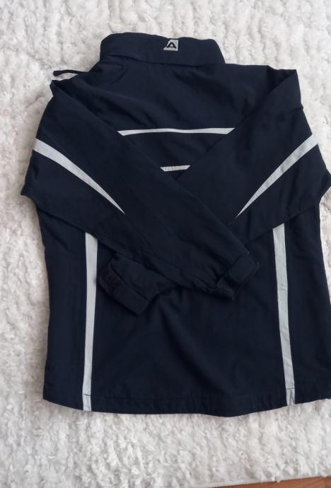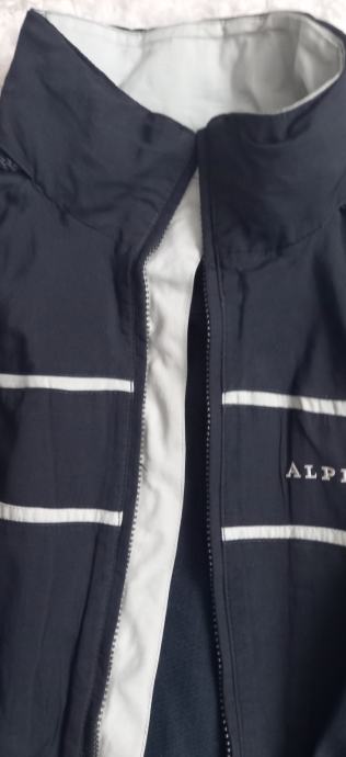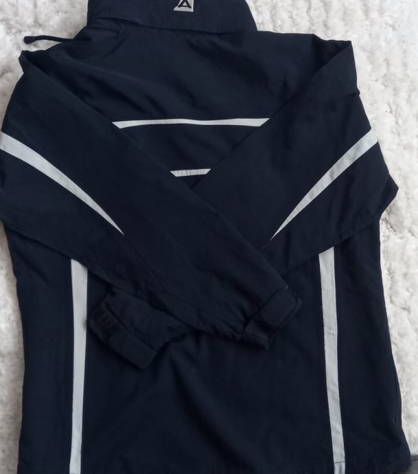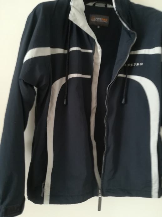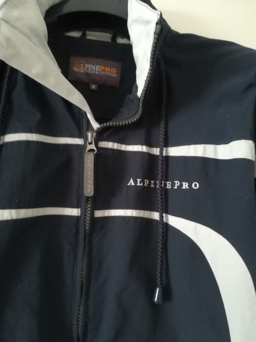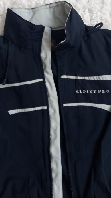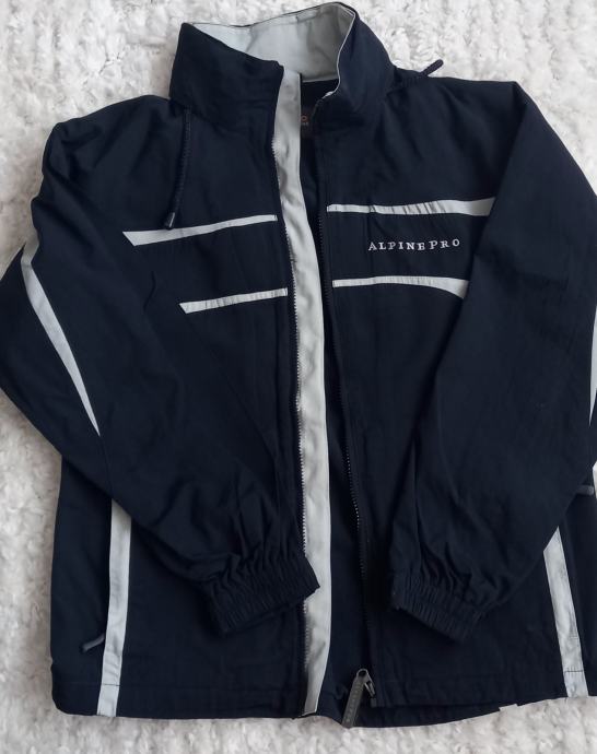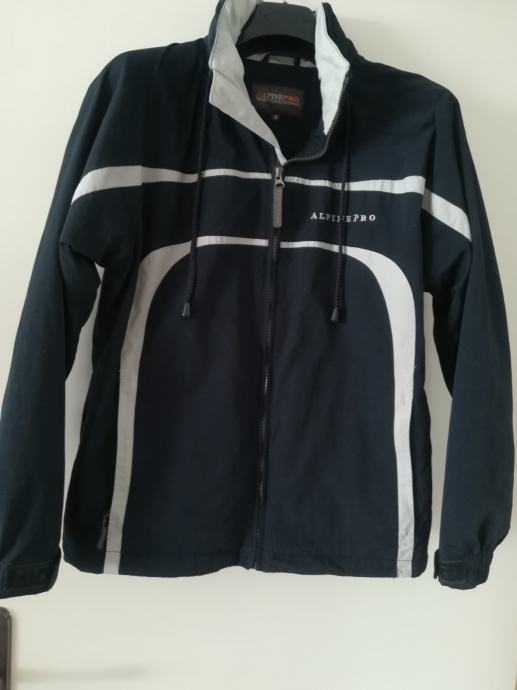 Ženska prehodna športna jakna (Alpinepro), velikosti M, modre barve s svetlo sivimi črtami.