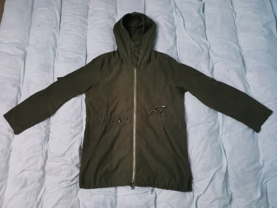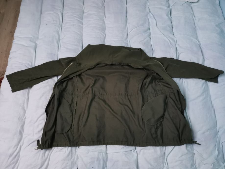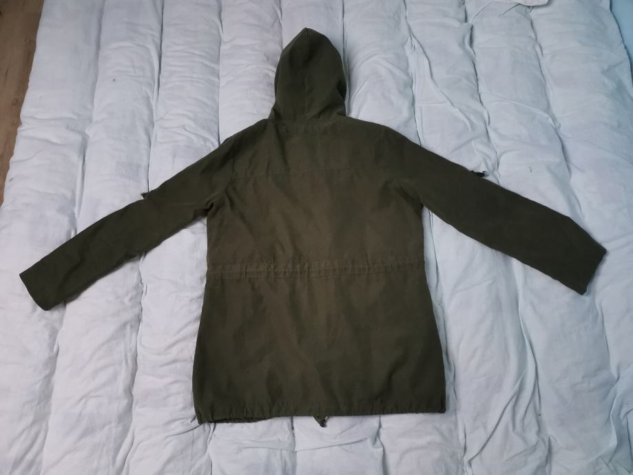 Odlično ohranjena. Material je poliester. Barva je olivno zelena. Mere: Širina pasu (na višini podpazduh) 52 cm Širina ramen 40 cm Dolžina vzdolž hrbta 66 cm Dolžina rokava po notranji strani 43 cm Dolžina rokava po zunanji strani 55 cm. Dostavim zastonj v okolici Domžal ali na relaciji Kamnik - Ljubljana. Pošljem tudi po pošti na stroške kupca. Kontaktirajte me na bolhi ali po SMS. Za prvi stik na klice ne odgovarjam.