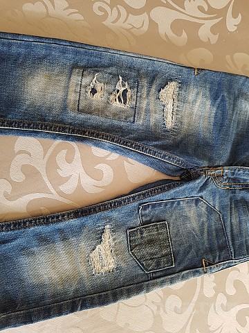 Material je 100% bombaž. So zelo lepo ohranjene. V pasu zadaj so stisnjene z elastiko, ki se da regulirati. Na sprednji strani sta dva notranja žepa, na zadnji pa dva zunanja. So zelo modne, natrgane, res hude. Nosil jih je samo en otrok.