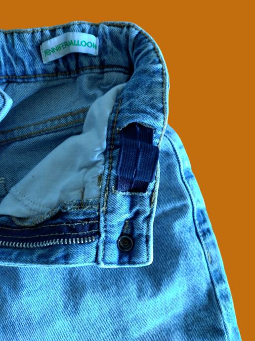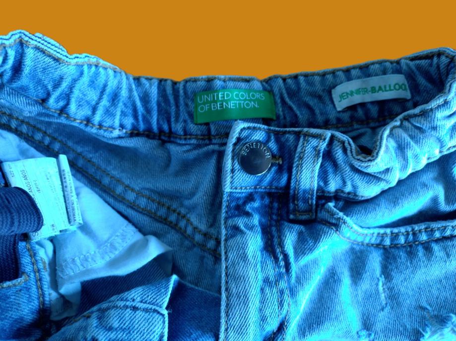 Prodam jeans hlače Benetton, svetle barve, širok model, v pasu elastika za nastavitev širine, raztrganine.