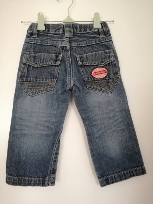 Prodam kavbojke oz. jeans hlače št. 86. Znotraj imajo mehanizem za zategnitev elastike. Notranja dolžina hlačnice (razkorak) cca. 29 cm, višina pasu cca. 16 cm. Žepi spredaj in zadaj.
