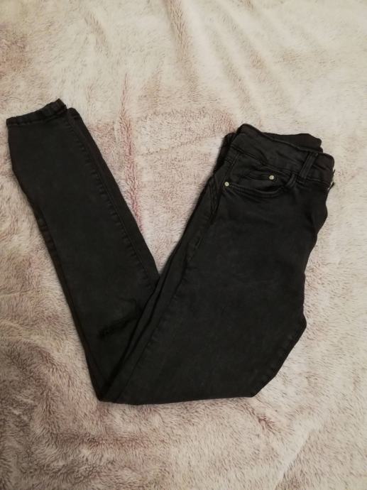 Bershka jeans slim hlače 36 ali 164. Samo oprane. Sivo črne barve (grey v trgovini) , raztrgan videz pri kolenih.