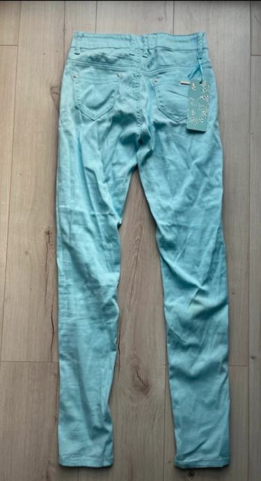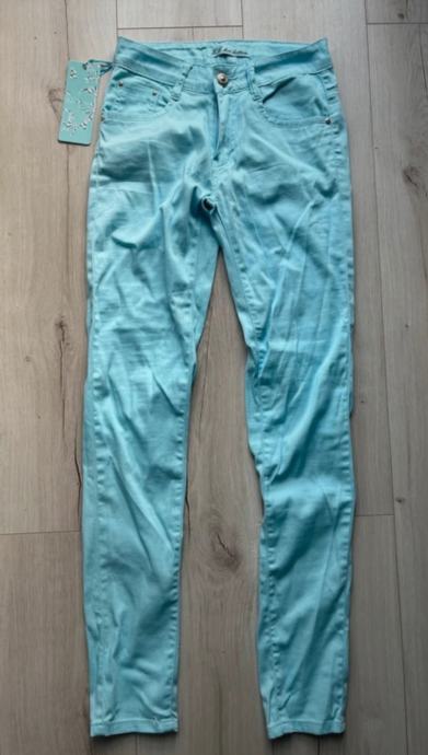 Turkizne jeans hlače. Na velikosti je sicer označeno kot velikost S, a so manjša številka. Mere navedene na sliki.