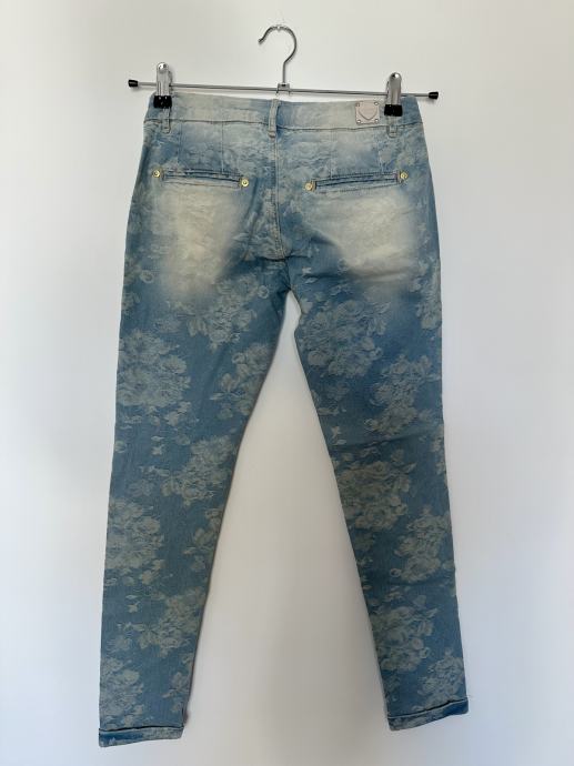 Prodam popolnoma nove, nikoli oblečene (le z odstranjeno etiketo) kavbojke Fracomina. Hlače imajo spredaj in zadaj po 2 žepa, sprednja sta na koncu dekoriranja s perlami. V pasu se zapnejo z zadrgo in gumbom, izvezene imajo nežne bele rožice. Imajo tudi 3 detajle s čipko.