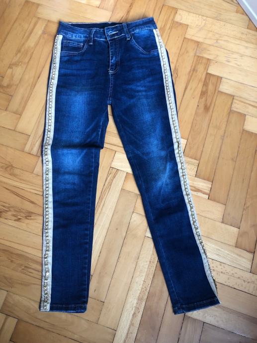 Prodajam nove modre skinny kavbojke velikosti M (vendar bolj primerne za S), okrašene s kristalčki ob strani. Hlače so iz elastičnega jeansa in povsem nove, nikoli nošene (zaradi napačne velikosti).